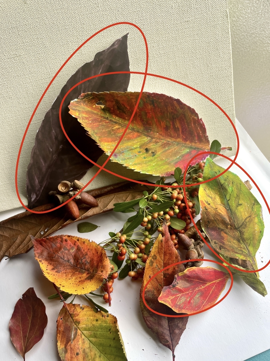 「落ち葉は茶色!」と、人はついつい固定概念で描いてしまいます。