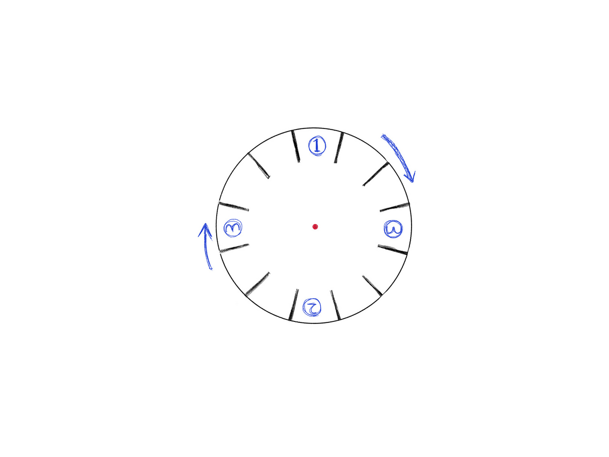 ①白い紙に基本のフォーマット(円盤に12本のスリットを入れる)を描いておきます。コピーして貼ったり写しても良い。今回は直径20cmくらいの大きさで作ります。A4サイズ内に収まるぐらいの大きさです。