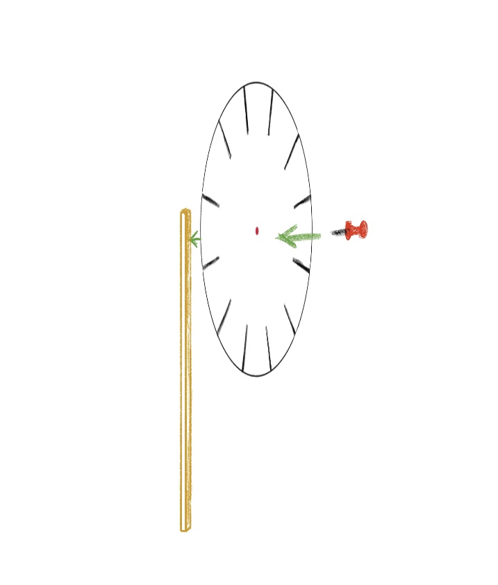 割り箸に円盤を画鋲で固定します。この時、円盤がくるくる回るぐらいの隙間を開けておくのがコツです。